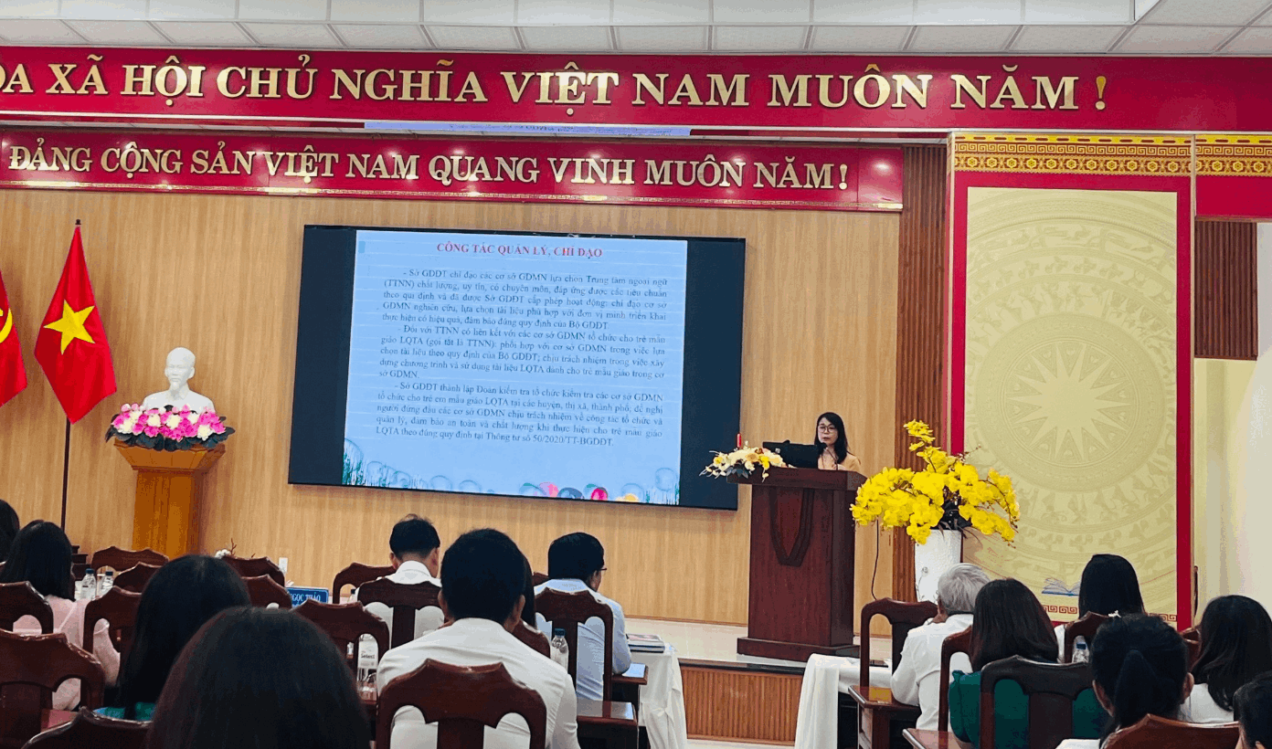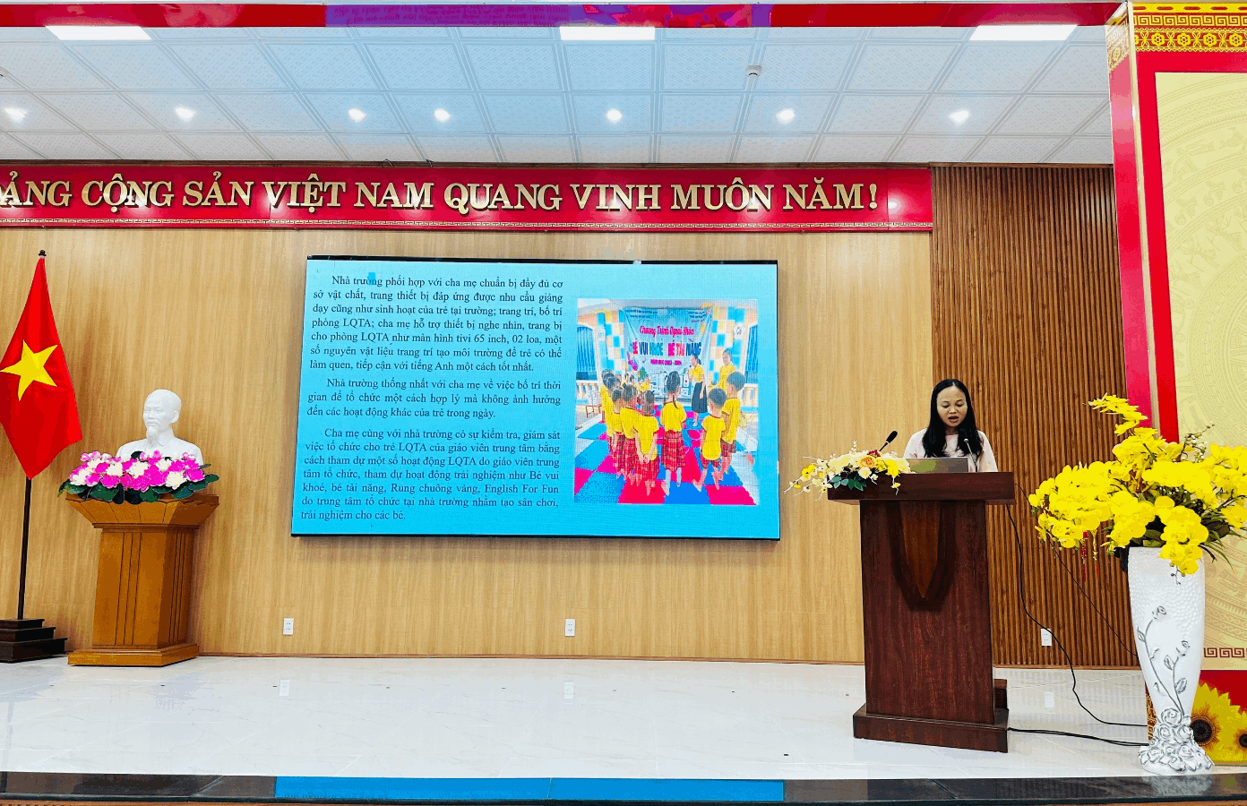Bà Trương Thu Nguyệt – Phó Trưởng phòng GDMN-GDTH báo cáo Sơ kết, đánh giá 03 năm triển khai chương trình LQTA cho trẻ em mẫu giáo.